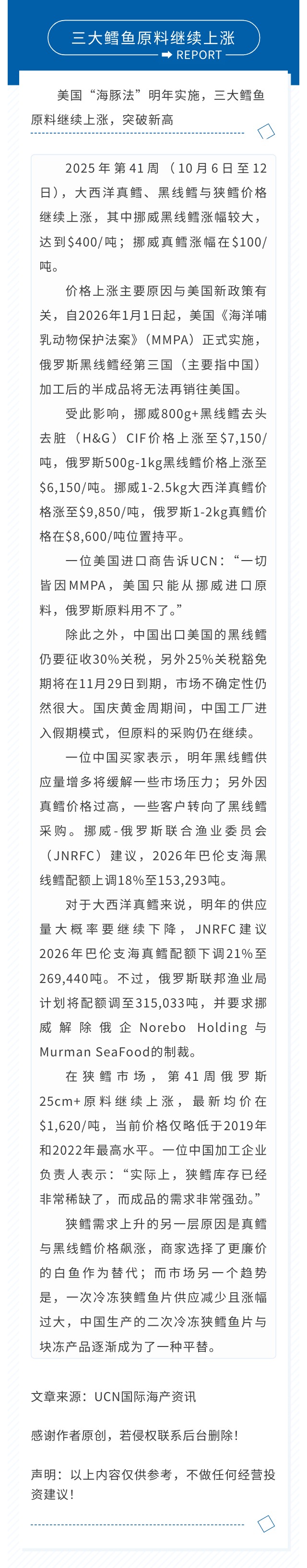 美国“海豚法”明年实施,三大鳕鱼原料继续上涨,突破新高