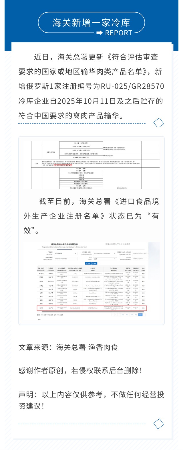 中国海关新增1家俄罗斯禽肉冷库,贮存禽肉产品获准输华!