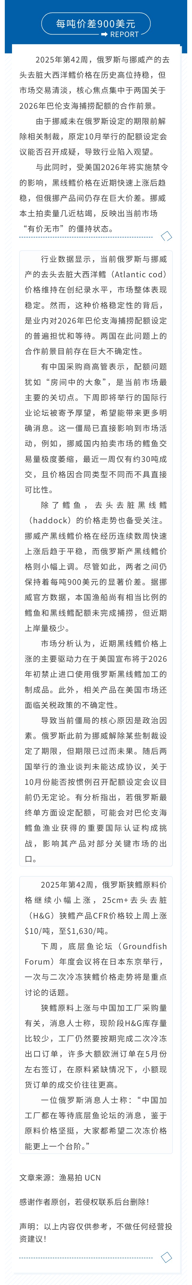 每吨价差900美元!美对俄禁令催生“双轨制”黑线鳕市场,挪威鱼价涨势戛然而止