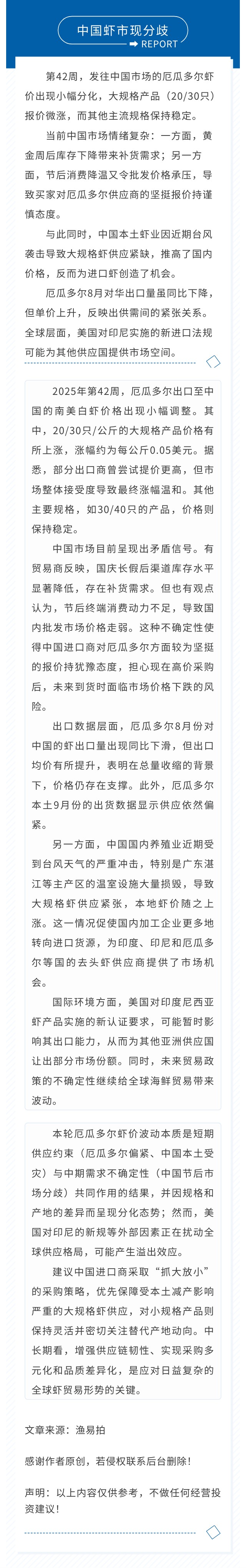 供需博弈加剧,中国虾市现分歧,厄瓜多尔大规格虾价温和上行