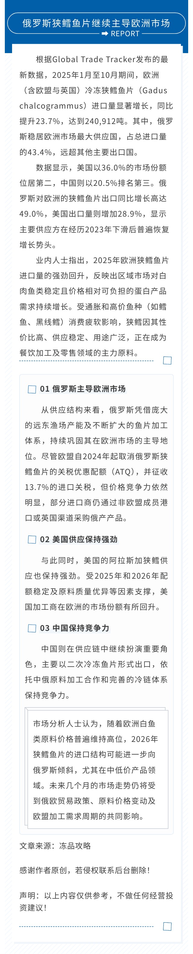 俄罗斯狭鳕鱼片继续主导欧洲市场