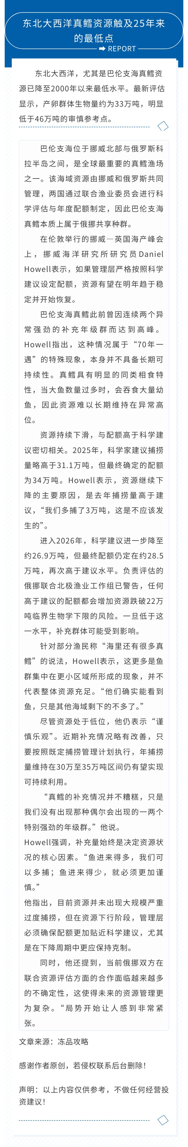 东北大西洋真鳕资源触及25年来的最低点