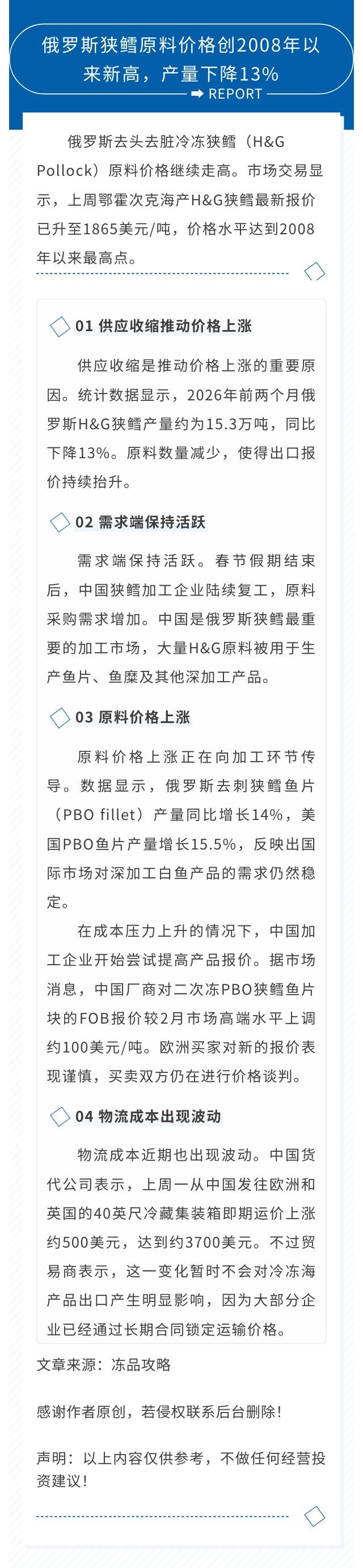 俄罗斯狭鳕原料价格创2008年以来新高,产量下降13%