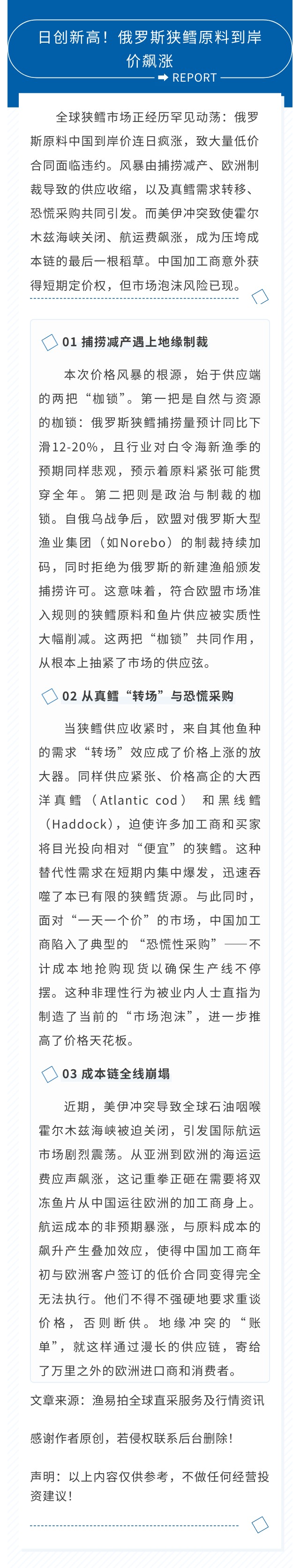 俄罗斯狭鳕原料到岸价飙涨