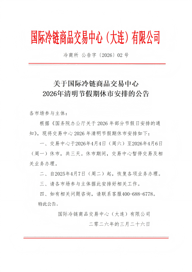 关于国际冷链商品交易中心2026年清明节假期休市安排的公告