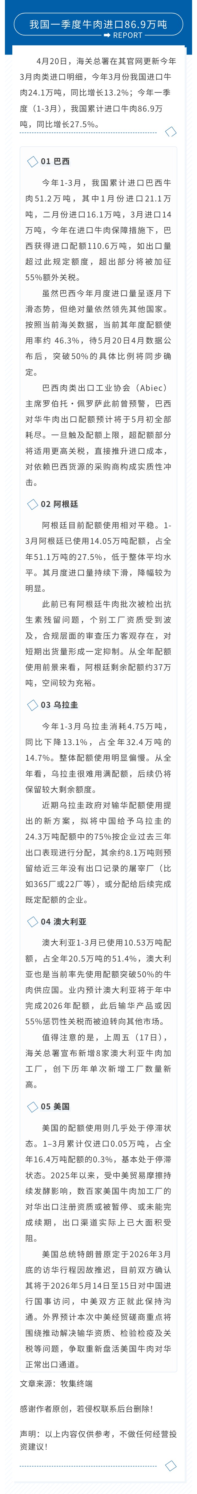 我国一季度牛肉进口86.9万吨