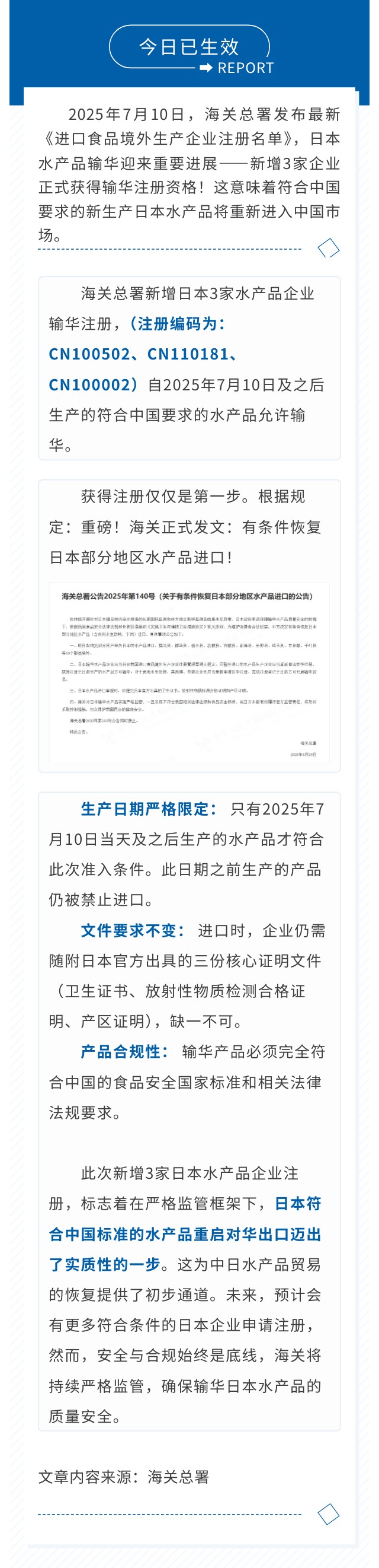 重磅,今日已生效!海关总署新增3家日本水产品企业输华注册!