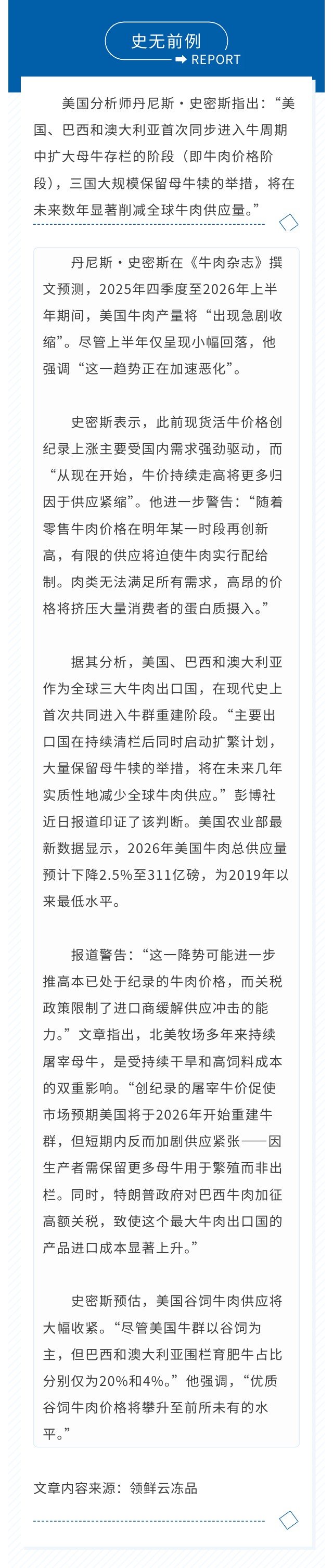 史无前例:美国、巴西、澳大利亚同步进入活牛供应下行周期 谷饲牛肉价格前所未有