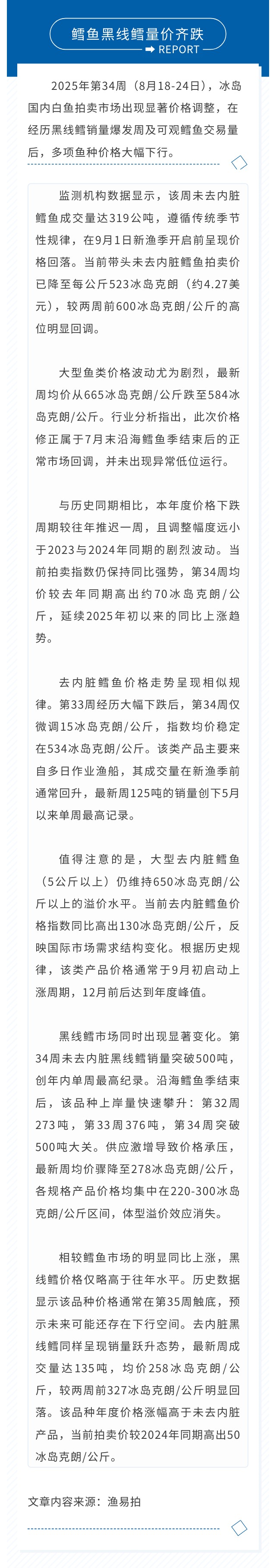 冰岛第34周白鱼拍卖价大跌!鳕鱼黑线鳕量价齐跌,季节性波动明显