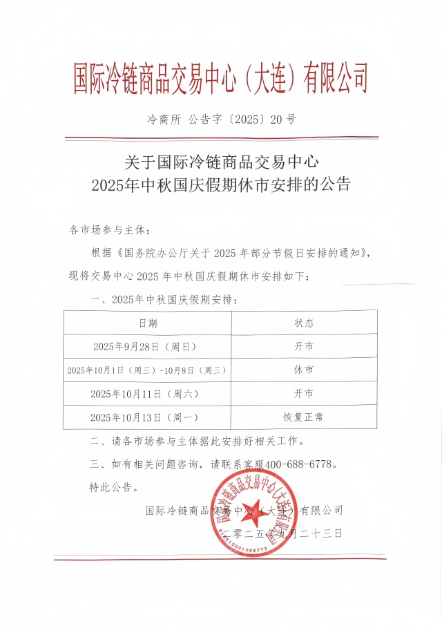 关于国际冷链商品交易中心2025年中秋国庆假期休市安排的公告