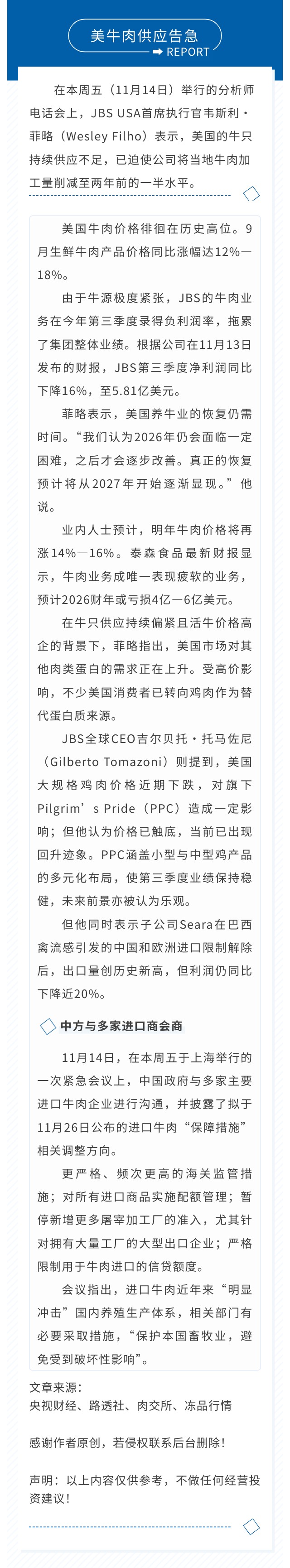 美牛肉供应告急!JBS着急喊话!中方与多家进口商紧急会商