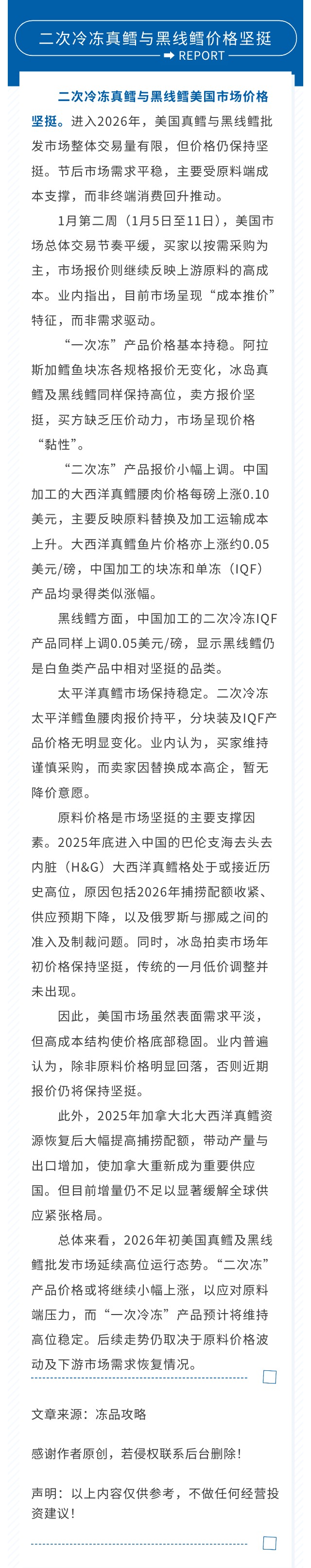 二次冷冻真鳕与黑线鳕美国市场价格坚挺