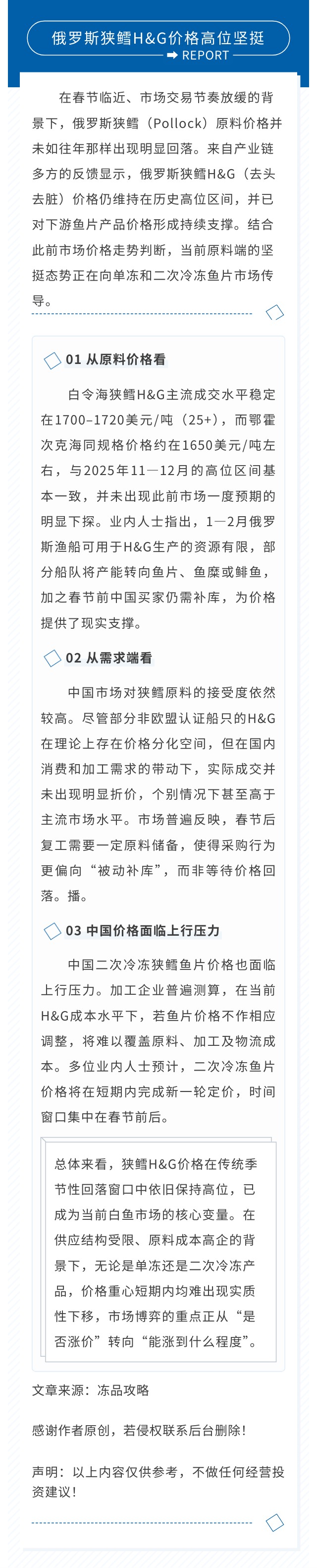 俄罗斯狭鳕H&G价格高位坚挺,对下游鱼片产品价格形成持续支撑