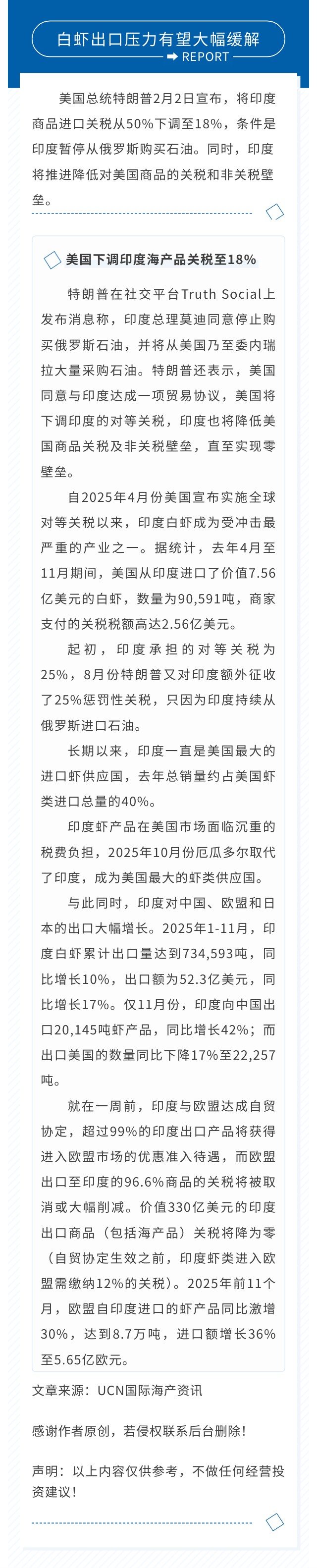 美国下调印度海产品关税至18%,白虾出口压力有望大幅缓解