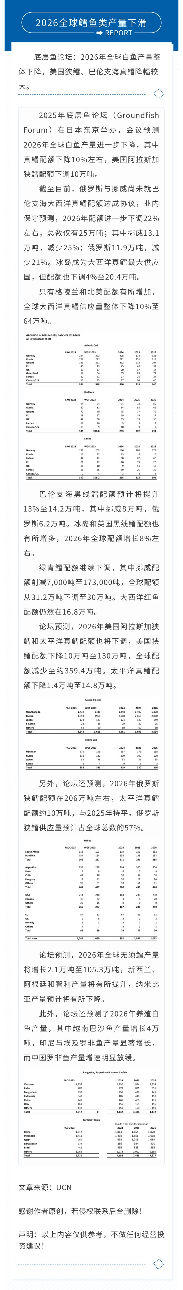 底层鱼论坛:2026全球鳕鱼类产量下滑,真鳕冰岛夺魁,狭鳕俄罗斯称霸!