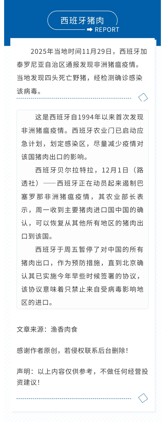 西班牙将恢复从未受猪瘟疫情影响地区的猪肉出口到中国!